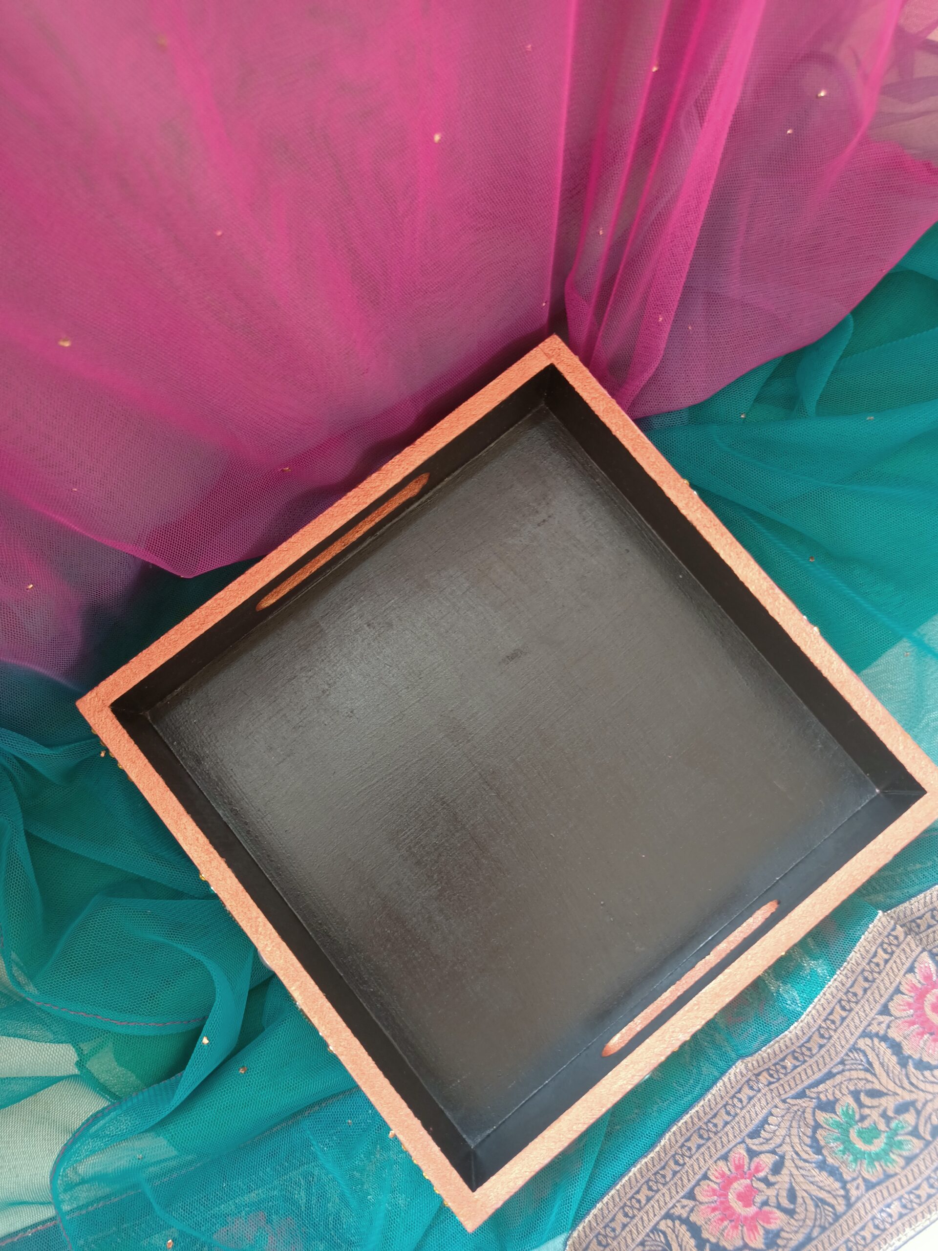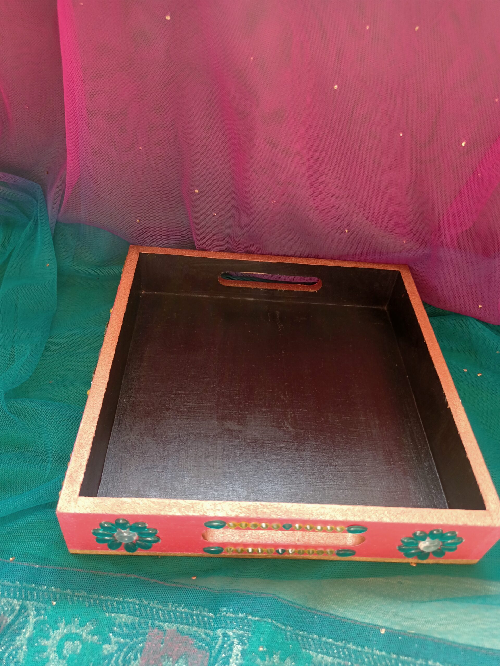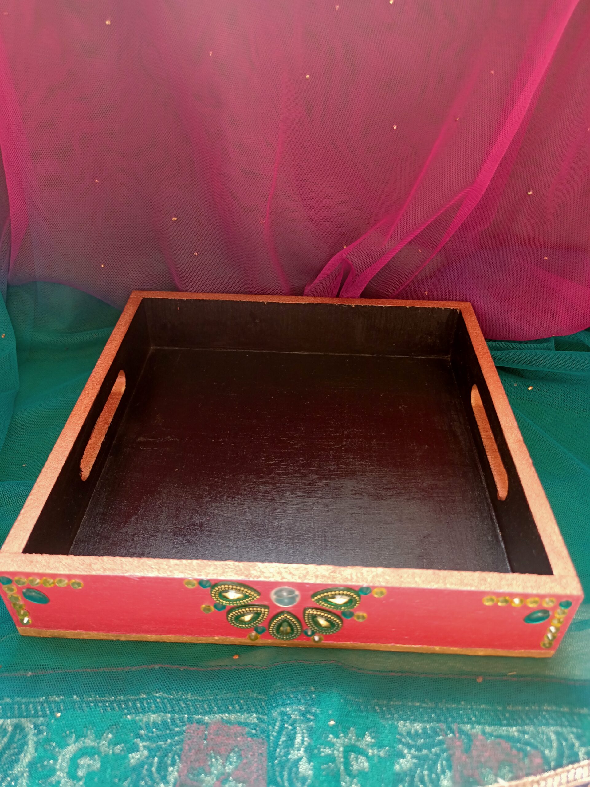 Brighten up your serving experience with our Luxurious Designer Serving Tray. Painted with colorful acrylics and decorated with shiny kundans, this tray has a smooth and shiny surface that looks great. It’s strong and big enough to serve drinks, appetizers, or desserts, making it perfect for hosting guests with ease and style.